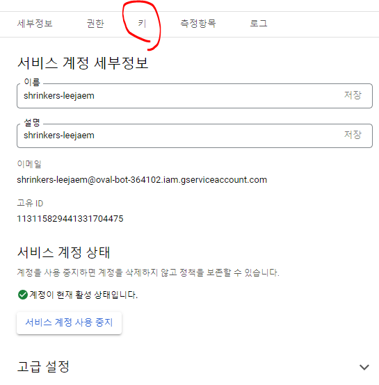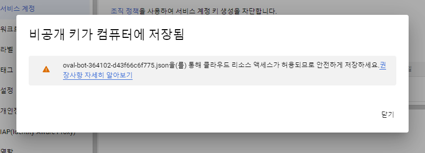 생성 완료 후 > 키 설정 > JSON 선택