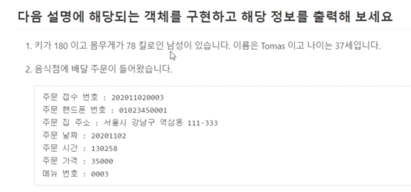 - 인스턴스 : new 키워드를 사용하며 클래스를 메모리에 생성한 상태