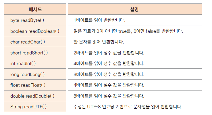 | int read(byte b[]) | 입력 스트림으로 부터 b[] 크기의 자료를 b[]에 읽습니다. 읽은 자료의 바이트 수를 반환합니다. |