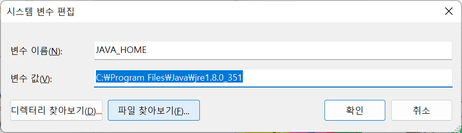 내 PC -> 속성 -> 고급 시스템 설정 -> 환경 변수 -> 새로만들기 -> 변수이름 : JAVA_HOME, 변수 값 : C:\Program Files\Java\jdk1.8.0_351 -> Path 편집 -> 새로만들기 -> %JAVA_HOME%\lib