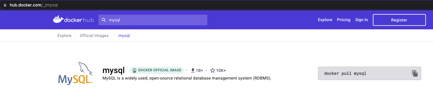 접속해서 mysql 검색후 docker pull mysql 복사