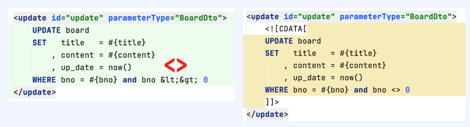 또는 특수문자가 포함된 쿼리를 <![CDATA[와]]> 로 감싼다